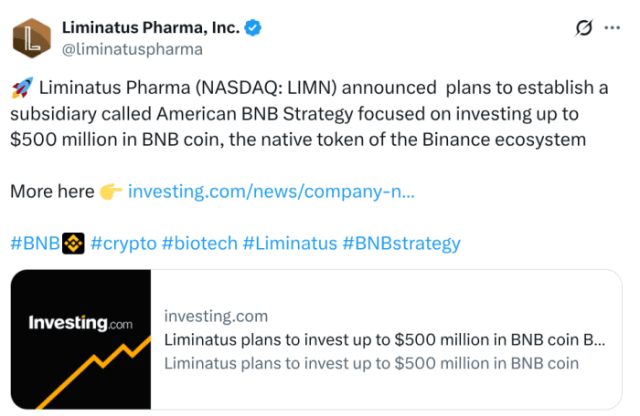Two other major corporations, Liminatus Pharma (NASDAQ: LIMN) and Windtree Therapeutics (NASDAQ: WINT), also announced massive $BNB treasury allocations. Liminatus Pharma is planning an ‘American BNB Strategy’ subsidiary, pouring up to $500M into $BNB for the long haul.