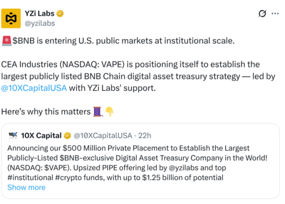CEA Industries (NASDAQ: VAPE), once just a vape company, has shifted its strategy. They’ve secured a massive $500M private investment deal that will establish them as the world’s largest publicly traded company with a $BNB treasury.