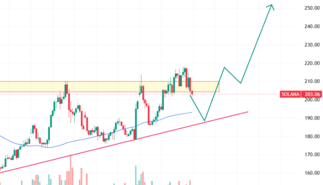 From a technical perspective, $SOL appears to be consolidating around $200.