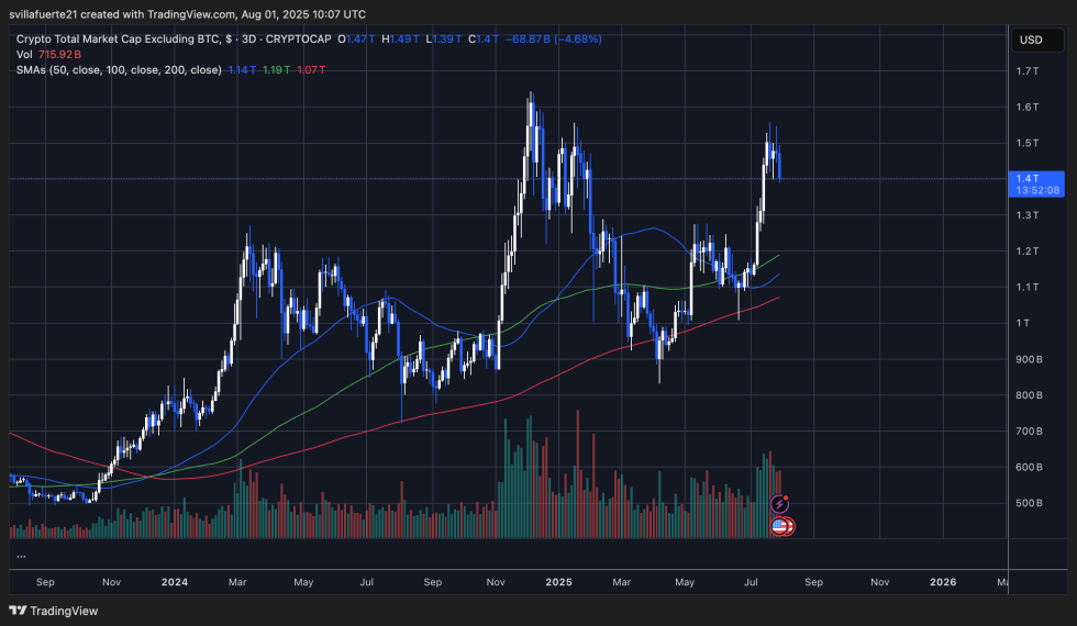 The total crypto market cap excluding Bitcoin (TOTAL2) has experienced a sharp pullback, dropping nearly 4.7% from its recent peak of $1.49 trillion to around $1.40 trillion. This move comes after a strong multi-week rally that saw the altcoin market cap surge from below $1.1 trillion to new yearly highs. However, the recent correction highlights growing selling pressure and short-term exhaustion among altcoins.