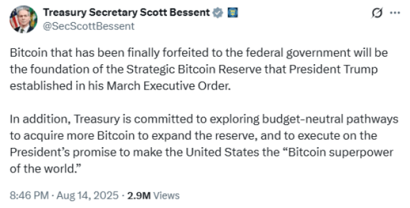 After $BTC took a tumble, Bessent didn’t hang around to set the record straight. He quickly took to X, saying the ‘Treasury is committed to exploring budget-neutral pathways to acquire more Bitcoin to expand the reserve.’
